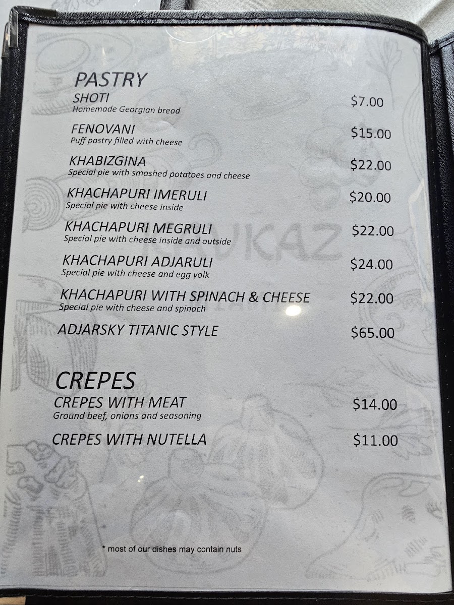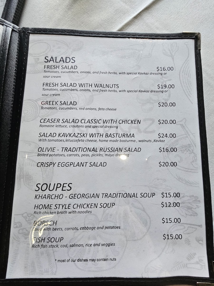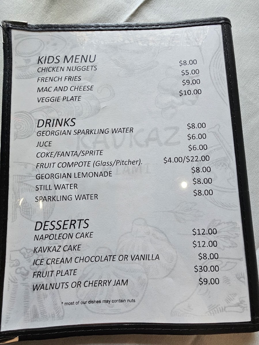 The menu at Kavkaz Restaurant offers a warm and inviting selection of traditional Georgian and Armenian dishes, thoughtfully crafted to suit a relaxed dining experience. Whether you're gathering for a leisurely lunch or enjoying a cozy dinner, the menu balances comforting flavors with authentic regional touches.
