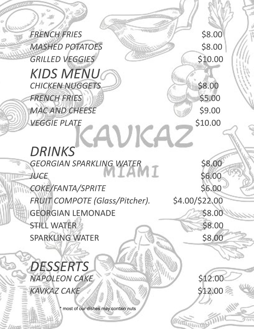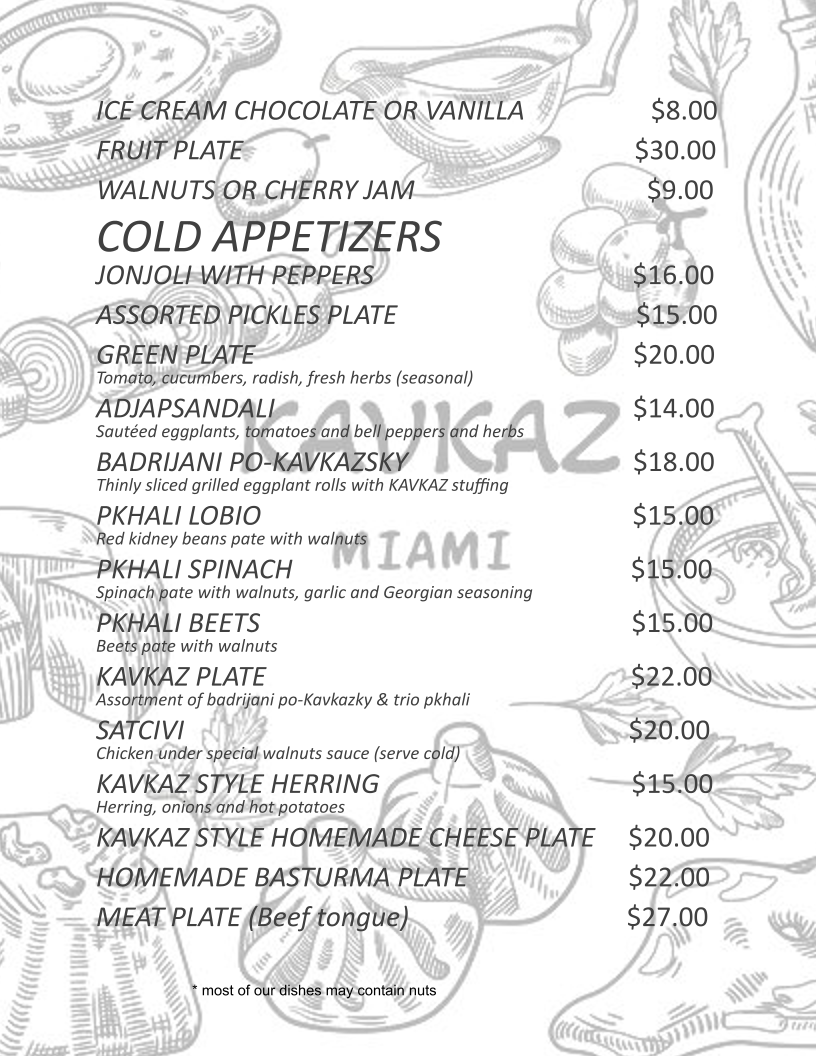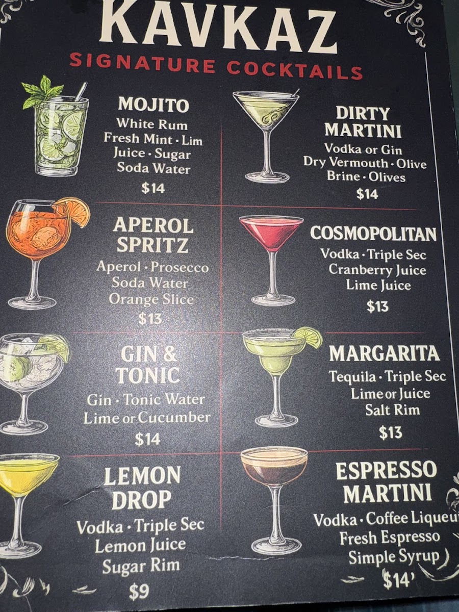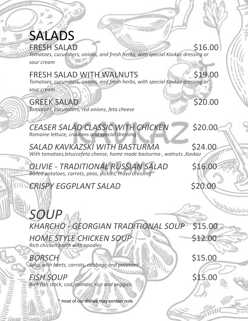 The menu at Kavkaz Restaurant offers a warm and inviting selection of traditional Georgian and Armenian dishes, thoughtfully crafted to suit a relaxed dining experience. Whether you're gathering for a leisurely lunch or enjoying a cozy dinner, the menu balances comforting flavors with authentic regional touches.